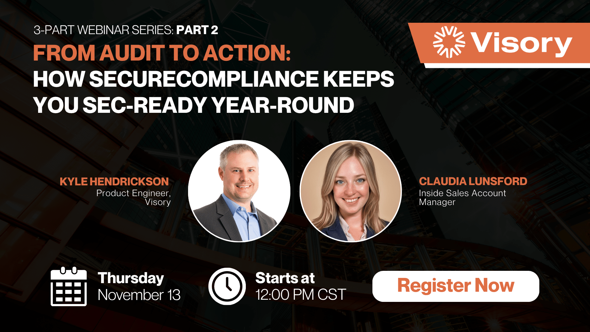 Join Visory experts Kyle Hendrickson and Claudia Lunsford as they show how SecureCompliance turns one-time audits into an ongoing, SEC-Ready program.